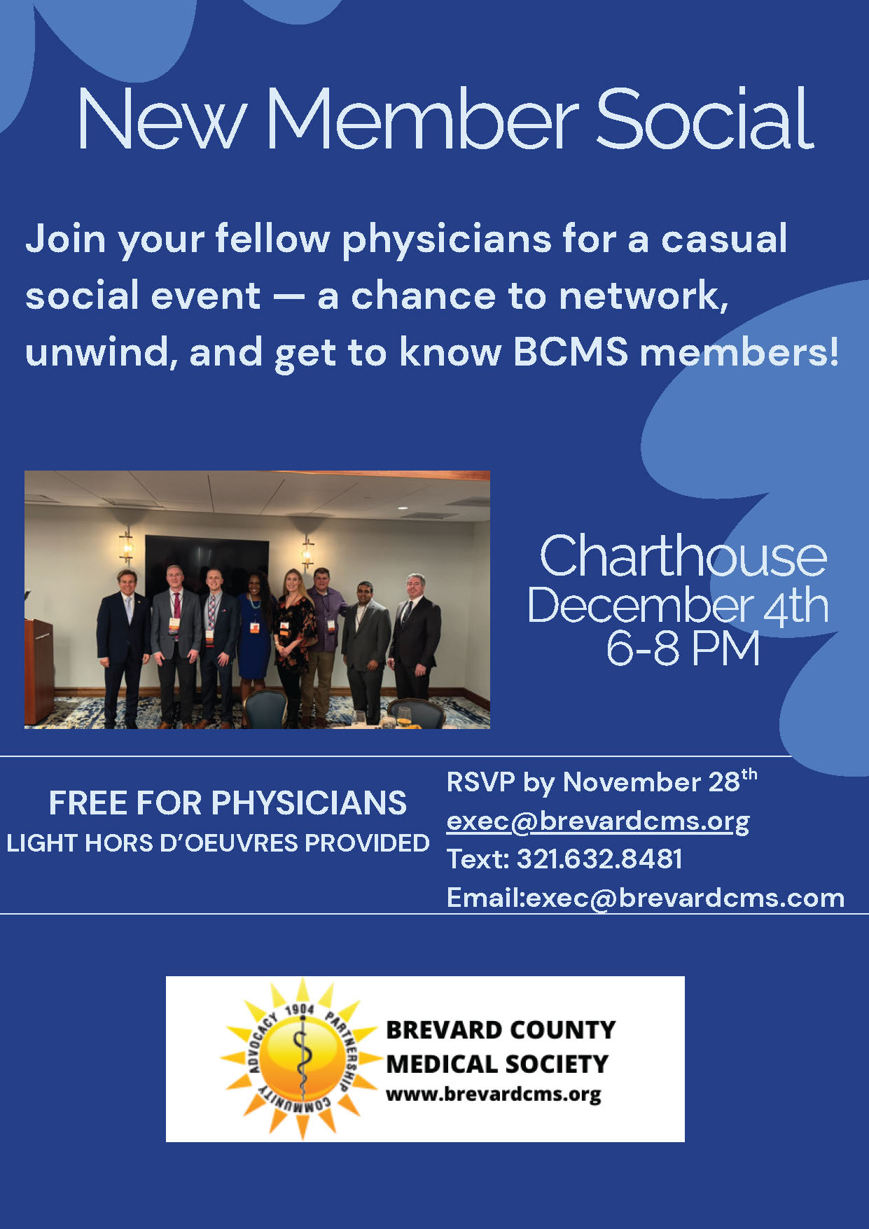 The Brevard County Medical Society provides an environment for physicians to come together to try to find solutions to problems facing their patients. It also provides a forum for open discussion of important socioeconomic issues facing physicians, medical practices and patients.